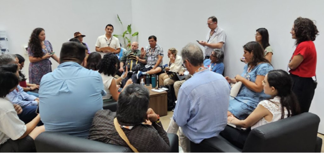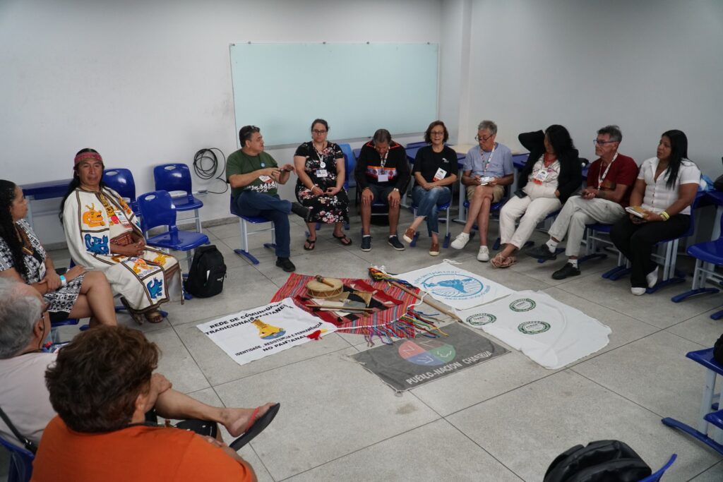 En paralelo, estuvimos en la Cumbre de los Pueblos acompañando actividades de organizaciones del Pantanal coordinadas por el Fórum Amazônico de Mudanças Climáticas (FORMAD), una red socioambiental que llevó a Belém propuestas de justicia climática y la defensa de los derechos territoriales de pueblos indígenas y comunidades locales. Allí se trabajó sobre reparación histórica, racismo ambiental y protección de territorios, con aportes de comunidades tradicionales y organizaciones de Mato Grosso como Asociación Taboca, FASE-MT, Fundación Ecológica Cristalino, Instituto Gaia de Pantanal, MST-MT y la Rede de Comunidades Tradicionais Pantaneira. Nuestro aporte se centró en fortalecer los diálogos bioculturales, ofrecer herramientas metodológicas y documentar problemáticas territoriales para su inclusión en espacios regionales de incidencia.
