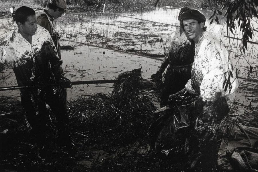 Trabajadores de Magdalena con indumentaria precaria contratados por la empresa Shell. Costa del Río de la Plata tras el derrame de Shell (1999). Registro factual del daño ambiental.