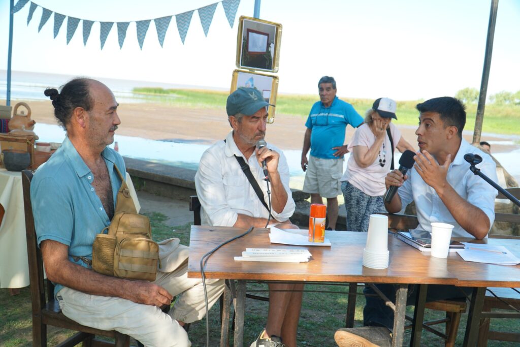 Marcelo Miranda y Alejandro Meitin en el encuentro de Magdalena, en diálogo sobre memoria ambiental, riesgos fluviales y prácticas territoriales.
