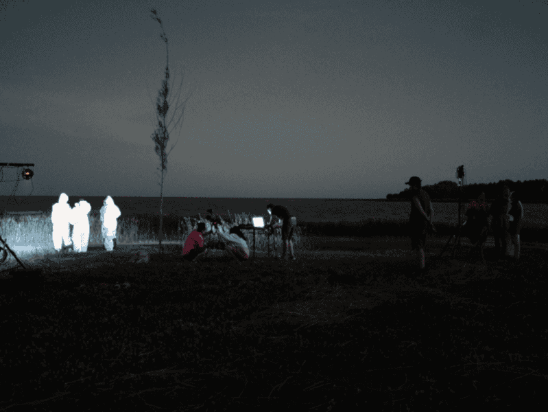 Rodaje de «La Teoría del Derrame»: docentes y alumnes secundaries de Magdalena con mamelucos de tyvek se sumergen el Río de la Plata. Foto: Agustina Constanza Crespo